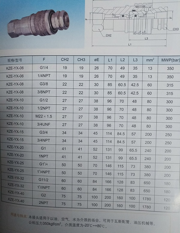 本接頭適用于以油、空氣、水為介質(zhì)的場合。可用于瓦斯配管,油壓機械等,公稱壓力350kgf/c㎡。 介質(zhì)溫度為-20℃~+80℃